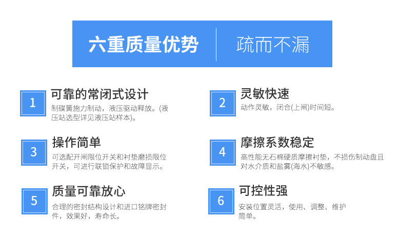 三、質(zhì)量過硬的主推產(chǎn)品公司以市場為導(dǎo)向,不斷開發(fā)培育新品種,開發(fā)推廣的優(yōu)良新品種有盤式制動(dòng)器(安全制動(dòng)器SB,SBD系列、電力液壓臂盤式Y(jié)PZ2系列、氣動(dòng)鉗盤式QP(CQP)系列)、鼓式制動(dòng)器(電力液壓YWZ系列、電磁鼓式ZWZ3系列、腳踏式TYW系列以及帶式制動(dòng)器DZ系列)、防風(fēng)制動(dòng)器(液壓輪邊型YLBZ系列、頂軌式Y(jié)DGZ系列和夾軌器YJGQ系列)和驅(qū)動(dòng)裝置(Ed系列、YT1系列和隔爆型BEd系列)。