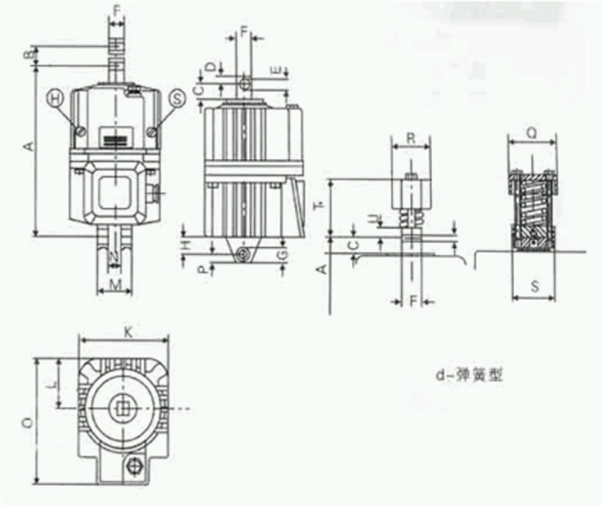 短行程推動(dòng)器可增設(shè)內(nèi)置式制動(dòng)彈簧( c-彈簧)、復(fù)位彈簧(w-彈簧)、緩沖彈簧( d-彈簧);